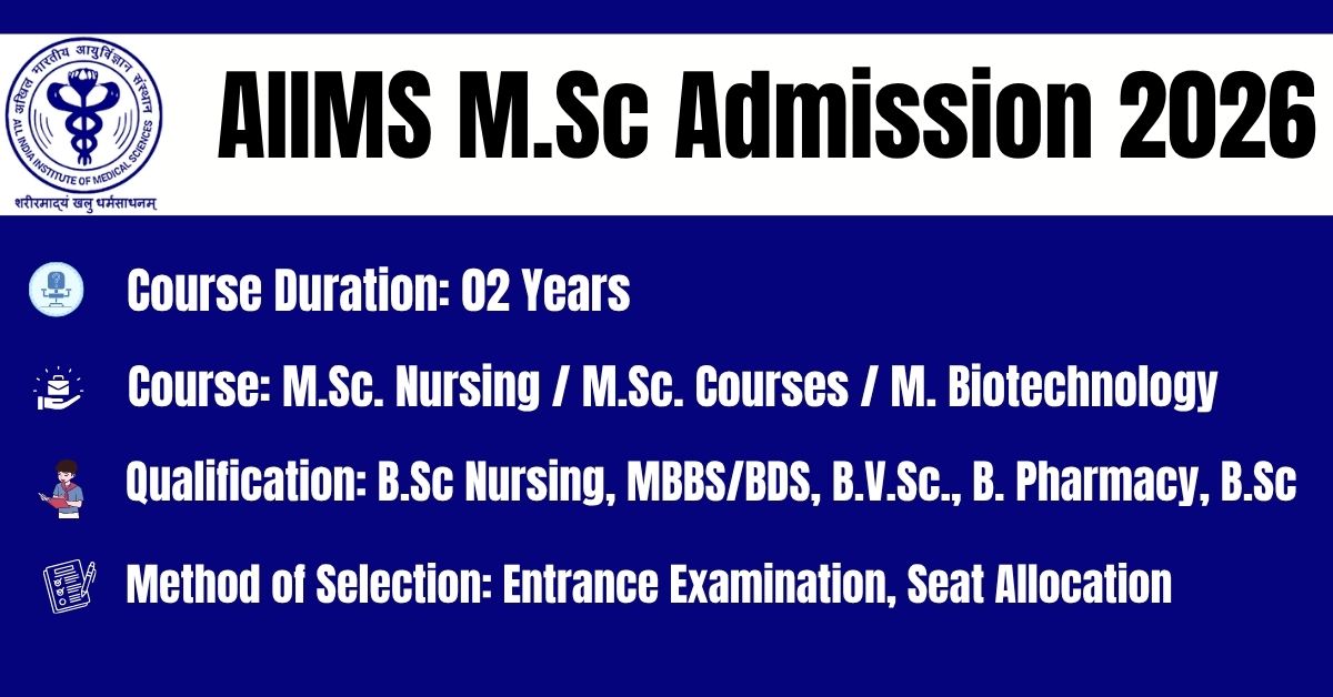 All India Institute Of Medical Sciences Admissions 2026: The All India Institute of Medical Sciences (AIIMS), New Delhi, has officially opened the online application window for the M.Sc. Nursing / M.Sc. Courses / M. Biotechnology Courses for the 2026 academic session. This M.Sc admission is strictly for B.Sc Nursing, MBBS/BDS, B.V.Sc., B. Pharmacy, B.Sc, Bachelor of Physio-therapy Students.