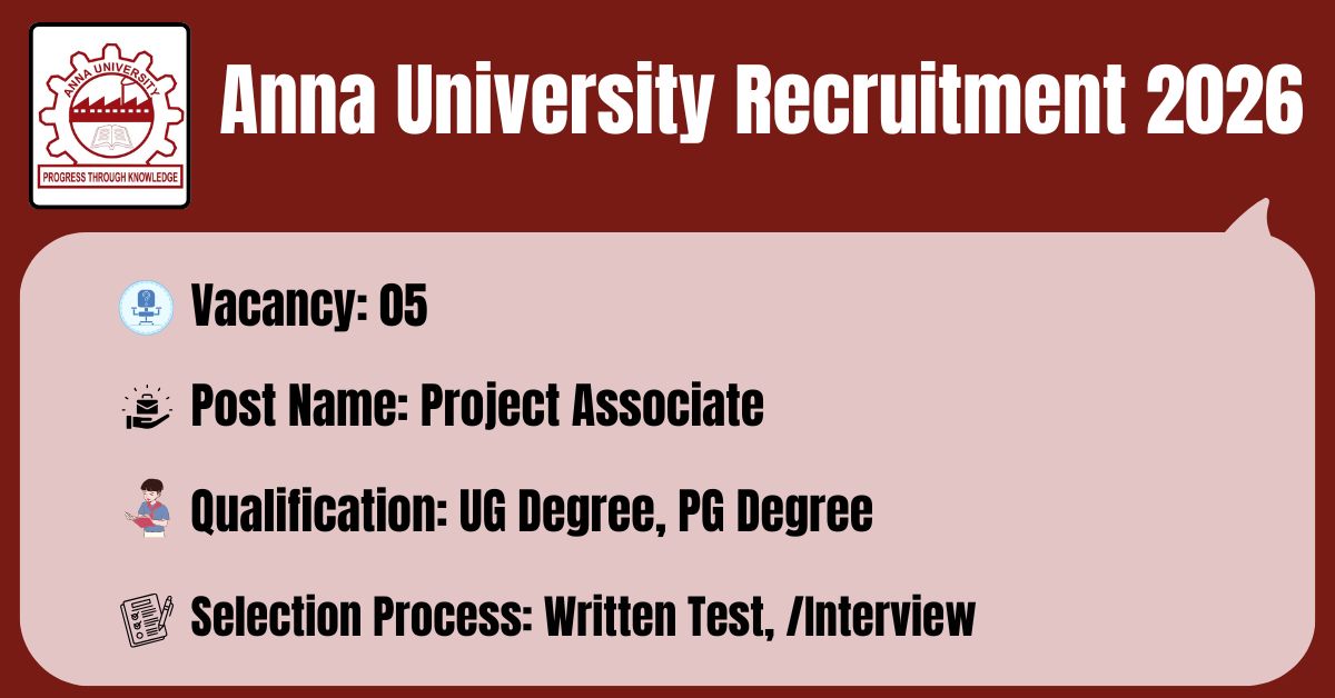 Anna University has released the recruitment notification to fill the 05 Project Associate – I, Project Associate – II Posts. The application form should be downloaded in PDF format from the official website @ https://www.annauniv.edu/ . The last date for the receipt of Filled application along with all enclosures is 28.02.2026 at 05.00 PM. Before submitting an application, candidates must carefully read the Anna University Project Associate 2026 notification and verify their eligibility.