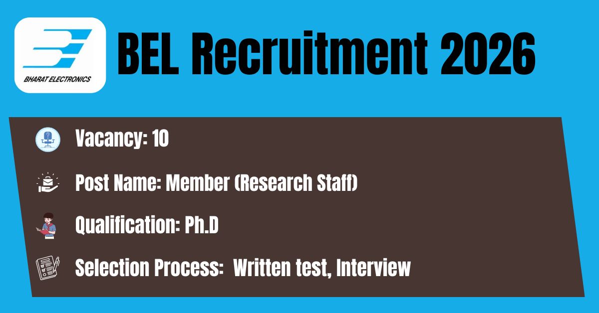 The Bharat Electronics Limited has released its latest official recruitment notification (Advt. No. 4926/M(RS)/HR/CRL-GAD/ALL-INDIA/2026-27) to fill the 10 Member (Research Staff) Posts.The online application portal at the official website (https://bel-india.in/) will remain active from 25.02.2026 to 02.04.2026. Before submitting an application, candidates must carefully read the BEL Member (Research Staff) 2026 notification and verify their eligibility.