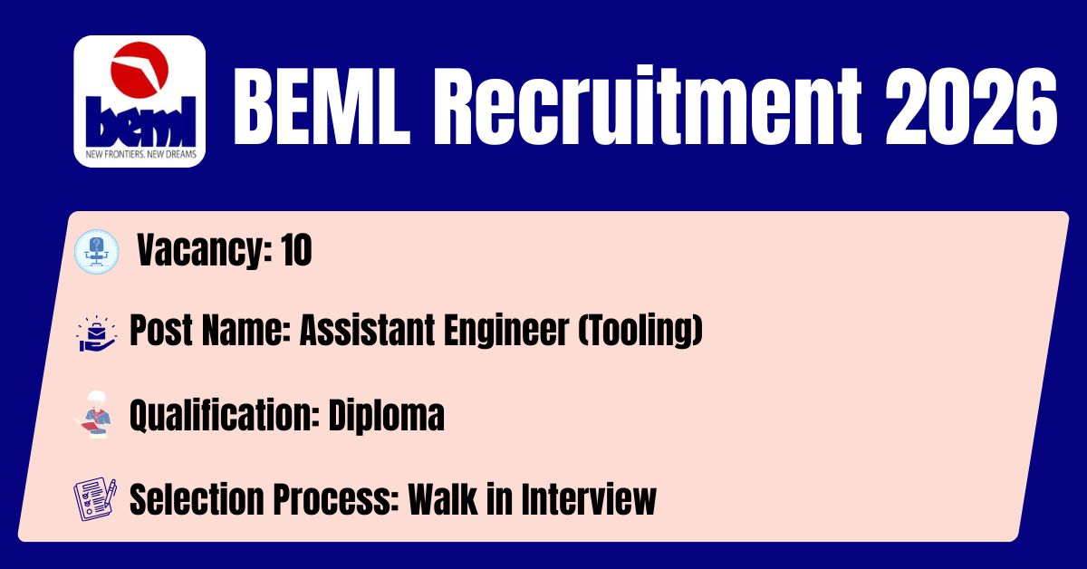 The BEML Limited has released its latest official recruitment notification (Advt. No. KP/S/05/2026 Dt.22.04.2026) to fill the 10 Assistant Engineer Posts. Applicants meeting the requirements notified may submit their application through online mode from 22.04.2026 to 03.05.2026 and the Online Application form facility can be accessed through BEML Limited website https://beml.registrationform.in/ (Career Page).