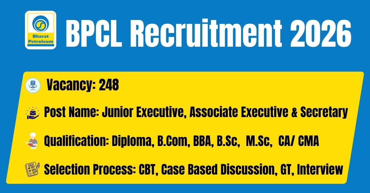 The BPCL – Bharat Petroleum Corporation Limited has released its latest official recruitment notification to fill the 248 Junior Executive (Engineering), Junior Executive (Accounts), Junior Executive (Wayside Amenities), Secretary, Associate Executive (Quality Assurance), Associate Executive (Official Language Implementation) Posts. Candidates may get the details of On-line Application, Detailed Advertisement, General Instructions and apply Online on the official Web-site of this BPCL – Bharat Petroleum Corporation Limited i.e. https://www.bharatpetroleum.in/. The link for submission of On-line Application Form will remain active from 18.04.2026 to 17.05.2026.