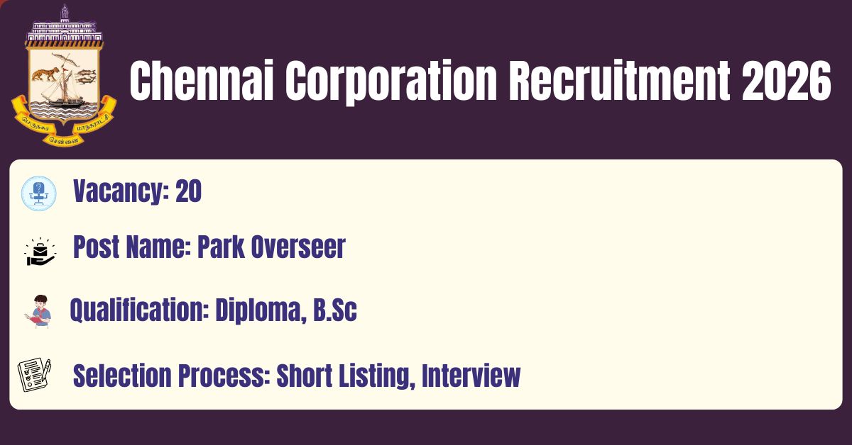 Chennai Corporation has released the recruitment notification to fill the 20 Park Overseer Posts. The application form should be downloaded in PDF format from the official website @ https://www.chennaicorporation.gov.in/. The last date for the receipt of Filled application along with all enclosures is 25.03.2026. Before submitting an application, candidates must carefully read the Chennai Corporation Park Overseer notification and verify their eligibility.