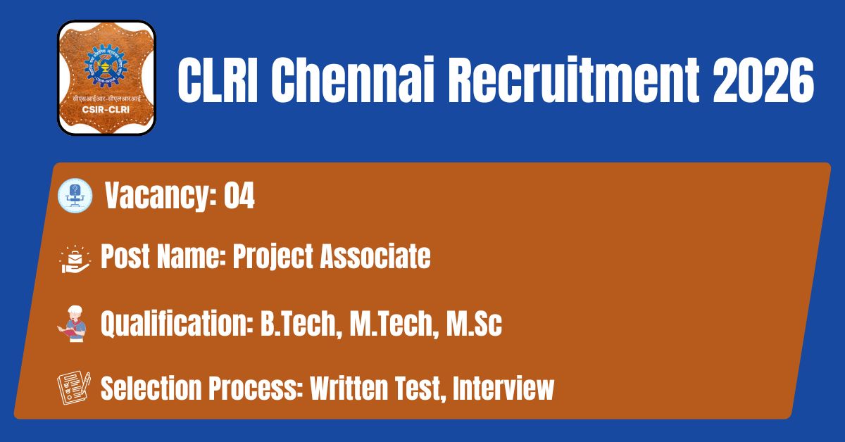 CLRI Chennai has released the recruitment notification No: 01/2026 to fill the 03 Project Associate-I Posts.You can obtain the application form in PDF format by visiting the Central Leather Research Institute’s website at https://clri.org/. Candidates must thoroughly read the CLRI Chennai Project Associate 2026 notice and confirm their eligibility before submitting an application.