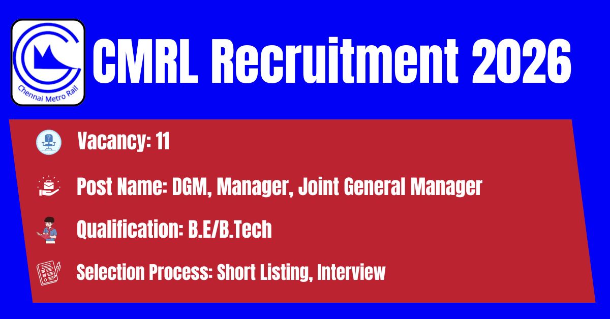 CMRL has released the recruitment notification No: CMRL/HR/CON/02/2026 to fill the 11 DGM, Manager, Joint General Manager Posts. This online facility will be available on the Official website @ https://chennaimetrorail.org/ from 11.02.2026 to 09.03.2026. Before submitting an application, candidates must carefully read the CMRL DGM, Manager 2026 notification and verify their eligibility.