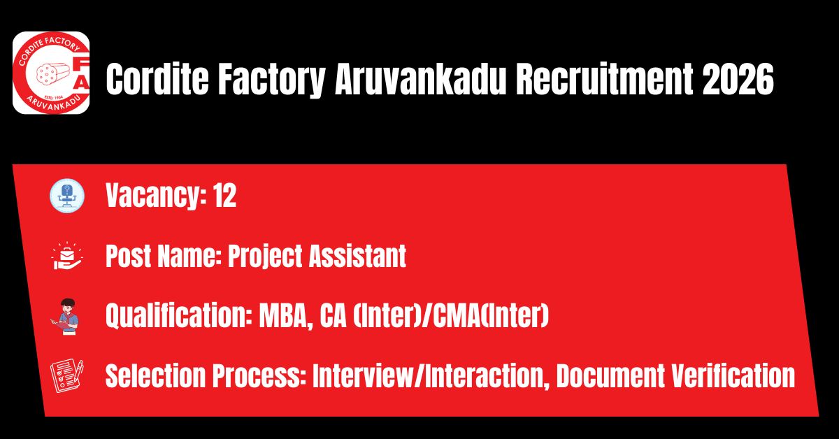 Cordite Factory Aruvankadu has released the recruitment notification to fill the 12 Project Assistant (HR), Project Assistant (FIN), Project Assistant (MM) Posts. The application form should be downloaded in PDF format from the official website @ https://ddpdoo.gov.in/. The last date for the receipt of Filled application along with all enclosures is 15.05.2026. Before submitting an application, candidates must carefully read the Cordite Factory Aruvankadu Project Assistant notification and verify their eligibility.