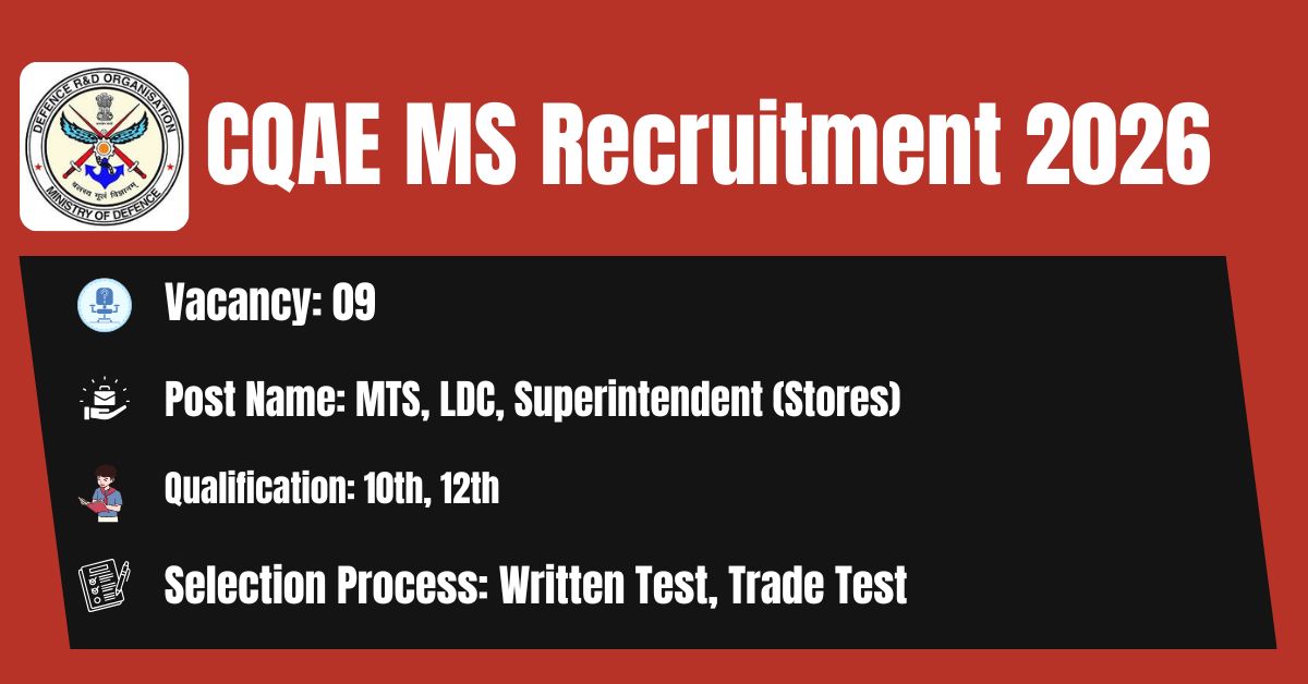 CQAE MS has released the recruitment notification No: 2381 / Group ‘C’/ 2025-26 / Mumbai to fill the 09 MTS, LDC, Superintendent (Stores) Posts. The application form should be downloaded in PDF format from the official website @ https://www.ddpmod.gov.in/. The last date for the receipt of Filled application along with all enclosures is 27.03.2026. Before submitting an application, candidates must carefully read the CQAE MS Group C notification and verify their eligibility.