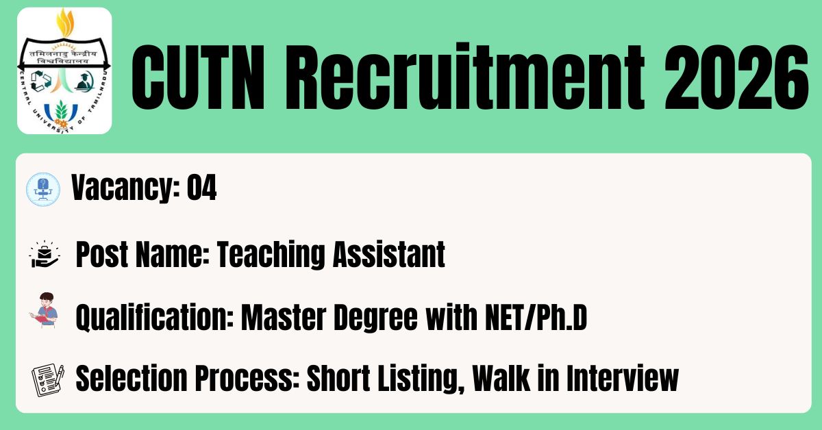 CUTN has released the recruitment notification No: CUTN/CC/GF/03/2026 to fill the 04 Teaching Assistant Posts. The application form should be downloaded in PDF format from the official website @ https://cutn.ac.in/. The last date for the receipt of Filled application along with all enclosures is 16.03.2026. Before submitting an application, candidates must carefully read the CUTN Teaching Assistant notification and verify their eligibility.