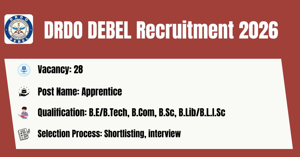 The Defence Bioengineering & Electromedical Laboratory (DEBEL), DRDO, Bangalore has officially announced a massive 2026 recruitment Notification (Advt. No. DEBEL/HRD/Apprentice/2026-27/01) to fill 28 Apprentice vacancies. The applicants satisfying the requisite qualification may apply through ONLINE MODE only, Apply Online on the official Web-site of this Defence Bioengineering & Electromedical Laboratory (DEBEL), DRDO, Bangalore i.e. https://drdo.gov.in/. The online application portal will be opened on 23.04.2026 for filling online applications and the date for closing the online application interface is 20.05.2026.