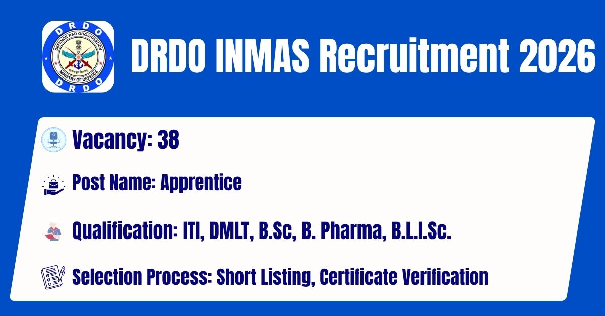 The Institute of Nuclear Medicine and Allied Sciences (INMAS) has released its latest official recruitment notification (Advt. No. INMAS/IRAC/APPR-01/2026-27) to fill the 38 Apprentice Posts. Candidates may get the details of On-line Application, Detailed Advertisement, General Instructions and apply Online on the official Web-site of the Institute of Nuclear Medicine and Allied Sciences (INMAS) i.e. https://drdo.gov.in/. The link for submission of On-line Application Form will remain active from 01.04.2026 to 30.04.2026.
