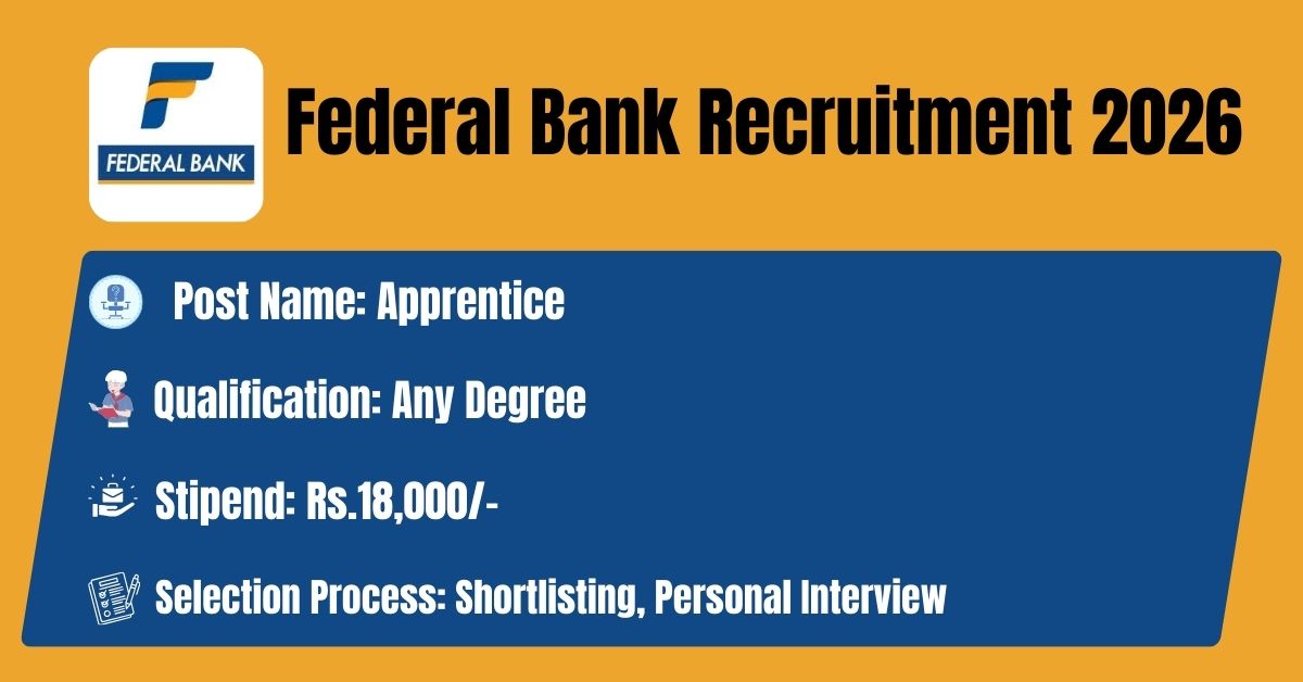 The Federal Bank has released its latest official recruitment notification (Advt. No. HRTD/Rec/App-02/2026) to fill the Apprentice Posts. Candidates may get the details of On-line Application, Detailed Advertisement, General Instructions and apply Online on the official Web-site of this Federal Bank i.e. https://www.federal.bank.in/. The link for submission of On-line Application Form will remain active from 10.03.2026 to 17.03.2026.