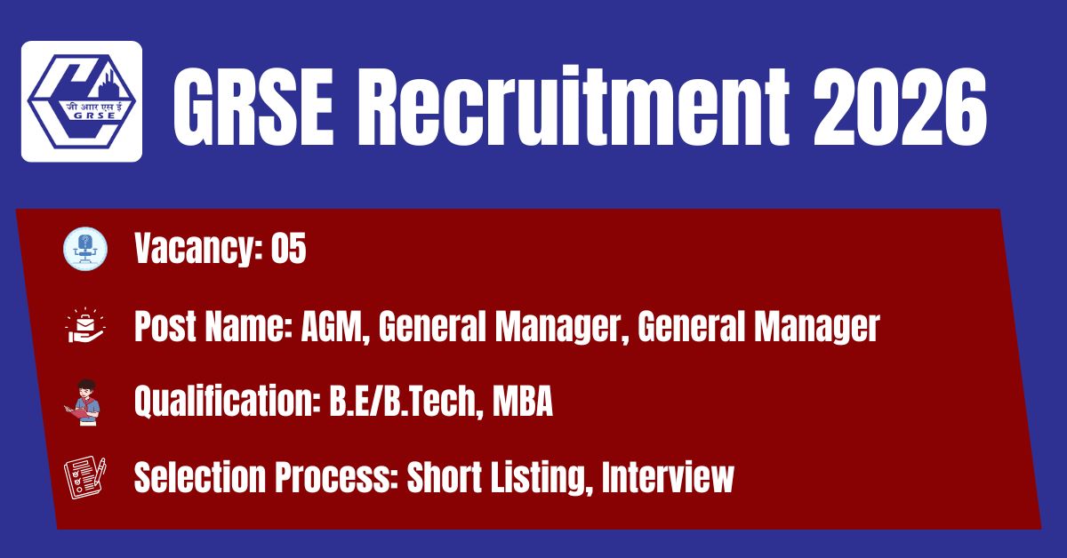 The GRSE Ltd has released its latest official recruitment notification (Advt. No. 2026/03 (O)) to fill the 05 Executive Director- Technical, General Manager- Technical, Commercial, General Manager- Technical, Additional General Manager- Technical, Senior Manager- Admin Posts. Candidates may get the details of On-line Application, Detailed Advertisement, General Instructions and apply Online on the official Web-site of this GRSE Ltd i.e. https://www.grse.in/. The link for submission of On-line Application Form will remain active from 09.03.2026 to 29.03.2026.