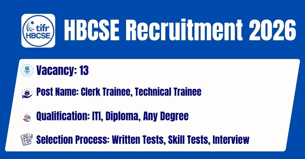 HBCSE has released the recruitment notification No: 01/2026 to fill the 13 Project Scientific Assistant – B, Project Assistant, Project Tradesman- B, Project Work Assistant, Clerk Trainee, Technical Trainee (Civil), Tradesman Trainee (Carpenter), Tradesman Trainee (Plumber) Posts. The application form should be downloaded in PDF format from the official website @ https://www.hbcse.tifr.res.in/. Before submitting an application, candidates must carefully read the HBCSE Clerk Trainee 2026 notification and verify their eligibility.
