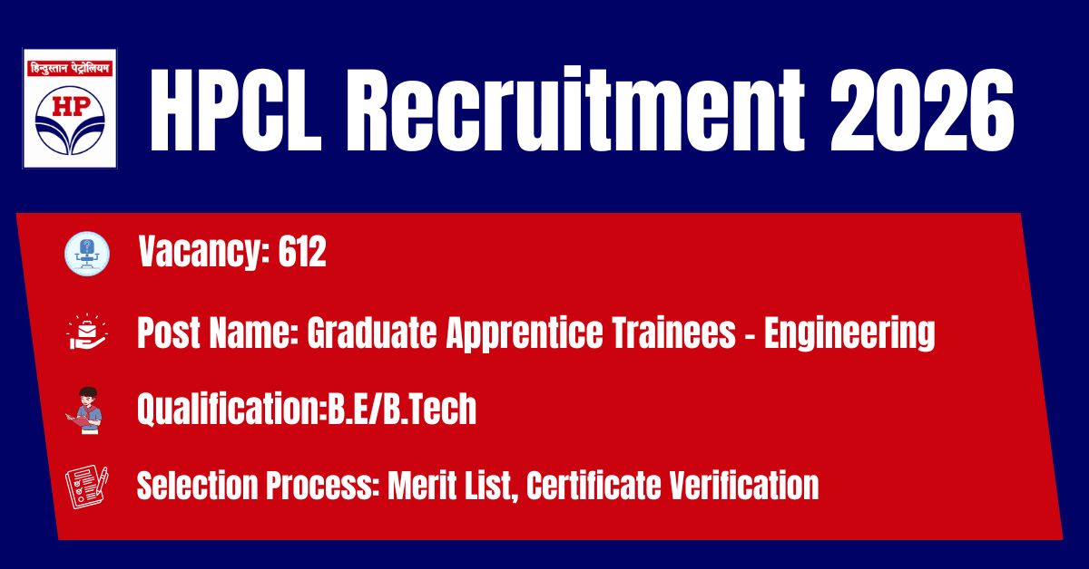 HPCL has released the recruitment notification to fill the 612 Graduate Apprentice Trainees – Engineering [Civil/ Mechanical/ Electrical / Instrumentation] Posts. This online facility will be available on the Official website @ https://www.hindustanpetroleum.com/ from 16.02.2026 to 02.03.2026. Before submitting an application, candidates must carefully read the HPCL Apprentice 2026 notification and verify their eligibility.