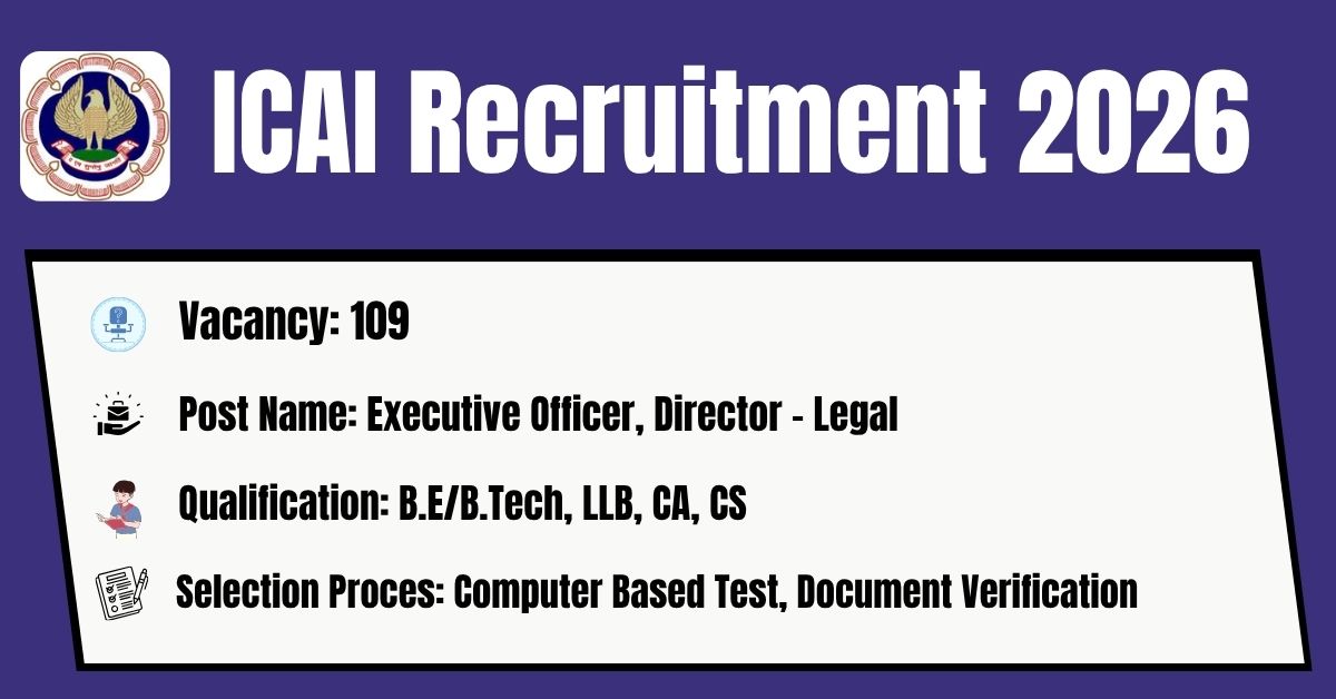 The Institute of Chartered Accountants of India (ICAI) has released its latest official recruitment notification (Advt. No. 04/2026/HRD/03) to fill the 109 Director – Legal, Executive Officer Posts. Candidates may get the details of On-line Application, Detailed Advertisement, General Instructions and apply Online on the official Web-site of The Institute of Chartered Accountants of India (ICAI) i.e. https://resource.cdn.icai.org/. The link for submission of On-line Application Form will remain active from 01.04.2026 to 15.04.2026.