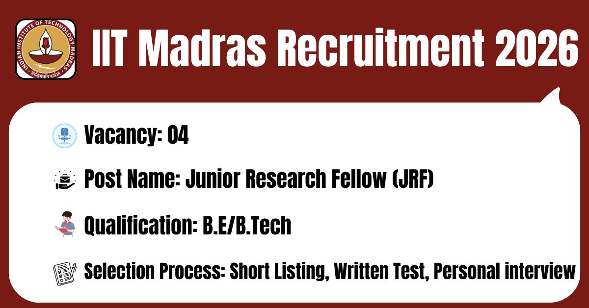 IIT Madras has released the recruitment notification No: ICSR/PR/Advt.46/2026 Dated: 09.04.2026 to fill the 04 Junior Research Fellow (JRF) Posts. The online application portal at the official website (https://icsrstaff.iitm.ac.in/) will remain active from 09.04.2026 to 23.04.2026. Before submitting an application, candidates must carefully read the IIT Madras Junior Research Fellow (JRF) 2026 notification and verify their eligibility.