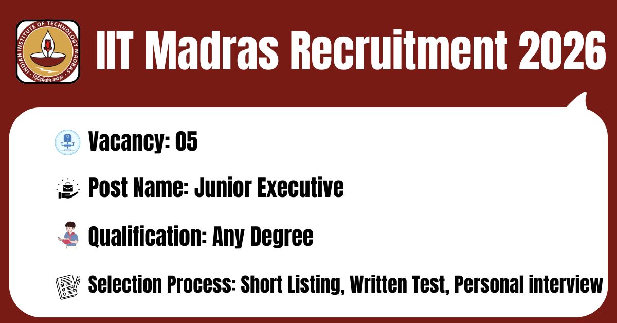 IIT Madras has released the recruitment notification No: ICSR/PR/Advt.45/2026 Dated: 06.04.2026 to fill the 05 Junior Executive Posts. The online application portal at the official website (https://icsrstaff.iitm.ac.in/) will remain active from 06.04.2026 to 26.04.2026. Before submitting an application, candidates must carefully read the IIT Madras Junior Executive 2026 notification and verify their eligibility.