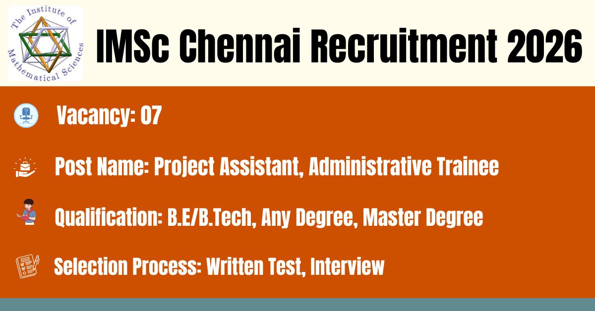 The IMSc – Institute of Mathematical Sciences has officially announced a massive 2026 recruitment Notification (Advt. No. 01-RIIMSc/2026) to fill 07 Project Associate – I, Project Assistant, Project Assistant, Administrative Trainee, System Trainee vacancies. The applicants satisfying the requisite qualification may apply through ONLINE MODE only, Apply Online on the official Web-site of this IMSc – Institute of Mathematical Sciences i.e. https://www.imsc.res.in/. The online application portal will be opened on 27.04.2026 for filling online applications and the date for closing the online application interface is 10.05.2026.