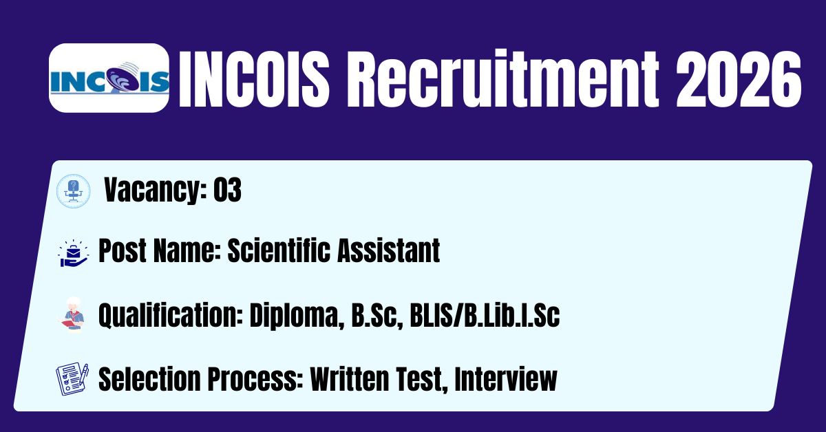 The Indian National Centre for Ocean Information Services (INCOIS) has released its latest official recruitment notification (Advt. No. INCOIS/RMT/01/2026) to fill the 03 Scientific Assistant Posts. Applicants meeting the requirements notified may submit their application through online mode from 22.04.2026 to 11.05.2026 and the Online Application form facility can be accessed through Indian National Centre for Ocean Information Services (INCOIS) website https://vacancies.incois.gov.in/ (Career Page).