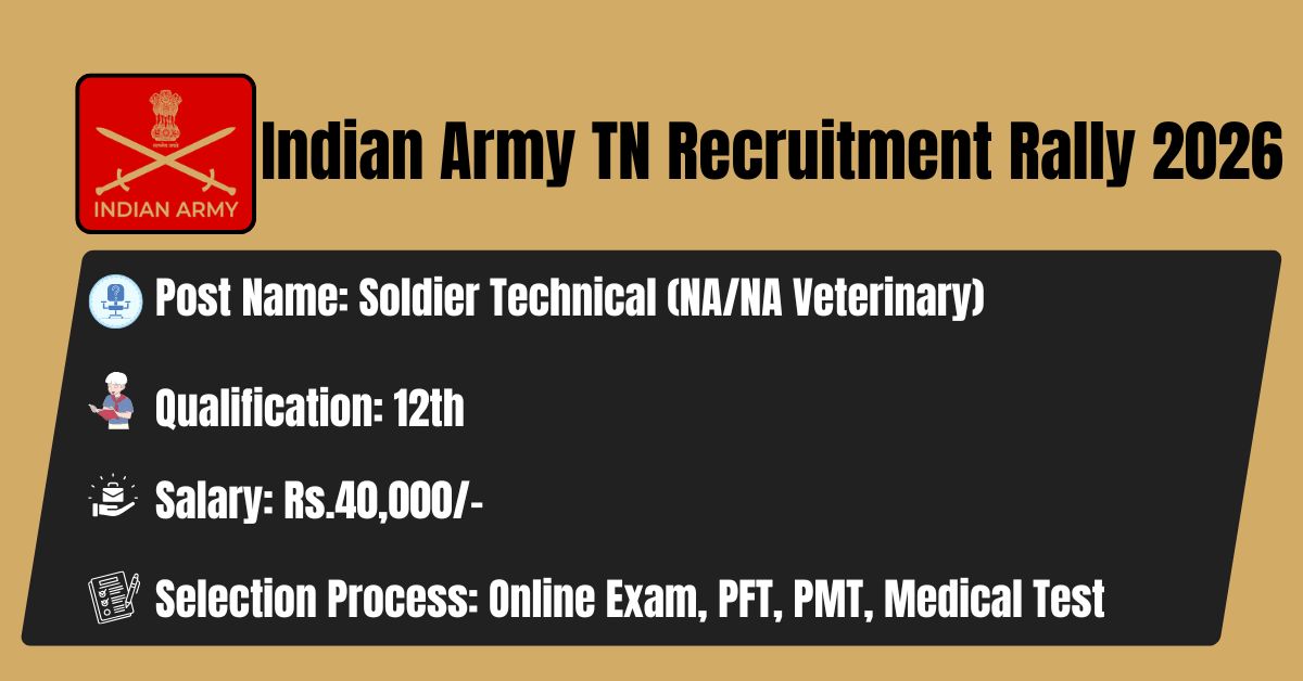 Indian Army has released the recruitment notification to fill the Agniveer – Male Soldier Technical Nursing Assistant / Nursing Assistant (veterinary) Posts. This online facility will be available on the Official website @ https://joinindianarmy.nic.in/ from 13.02.2026 to 01.04.2026. Before submitting an application, candidates must carefully read the Indian Army Agniveer – Soldier Technical (NA/NA Vet) 2026 notification and verify their eligibility.