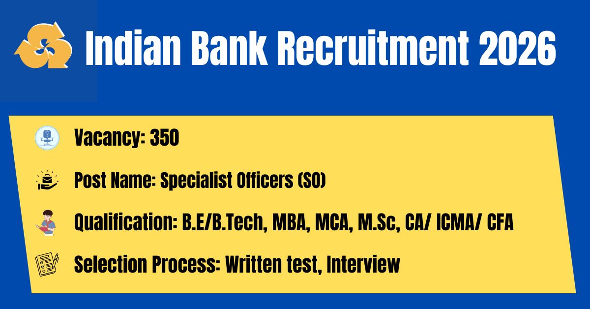 The Indian Bank has released its latest official recruitment notification to fill the 350 Specialist Officers (SO) Posts.The online application portal at the official website (https://indianbank.bank.in/) will remain active from 08.04.2026 to 28.04.2026. Before submitting an application, candidates must carefully read the Indian Bank SO 2026 notification and verify their eligibility.
