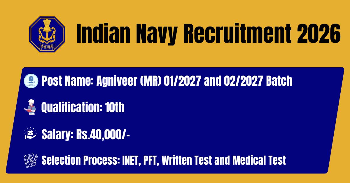 The Indian Navy has released its latest official recruitment notification to fill the unmarried male and unmarried female Candidates for Agniveer (MR) 01/2027 and 02/2027 Batch Posts.The online application portal at the official website (https://www.joinindiannavy.gov.in/) will remain active from 14.03.2026 to 06.04.2026. Before submitting an application, candidates must carefully read the Indian Navy Agniveer (MR) 01/2027 and 02/2027 Batch 2026 notification and verify their eligibility.
