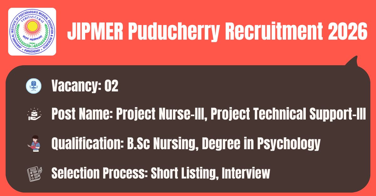JIPMER Puducherry has released the recruitment notification to fill the 02 Project Nurse-III (PN III), Project Technical Support-III (PTS III) Posts. The application form should be downloaded in PDF format from the official website @ https://www.jipmer.edu.in/. The last date for the receipt of Filled application along with all enclosures is 23.03.2026. Before submitting an application, candidates must carefully read the JIPMER Puducherry Project Nurse notification and verify their eligibility.