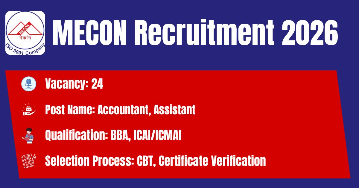 The MECON Limited has released its latest official recruitment notification (Advt. No. 11.73.4.3/2026/Reg/02) to fill the 24 Accountant, Assistant (HR) , Assistant (Administration), Assistant (Secretarial Service) Posts. Candidates may get the details of On-line Application, Detailed Advertisement, General Instructions and apply Online on the official Web-site of this MECON Limited i.e. https://careers.meconlimited.co.in/. The link for submission of On-line Application Form will remain active from 07.04.2026 at 11.00 AM to 06.05.2026 at 11.59 PM.