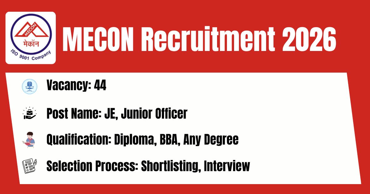 The MECON LIMITED has released its latest official recruitment notification (Advt. No. 11.73.4.3/2026/Reg/01 dated: 02.02.2026) to fill the 44 JE, Junior Officer Posts.The online application portal at the official website (https://careers.meconlimited.co.in/) will remain active from 06.03.2026 to 05.04.2026. Before submitting an application, candidates must carefully read the MECON JE, Junior Officer 2026 notification and verify their eligibility.