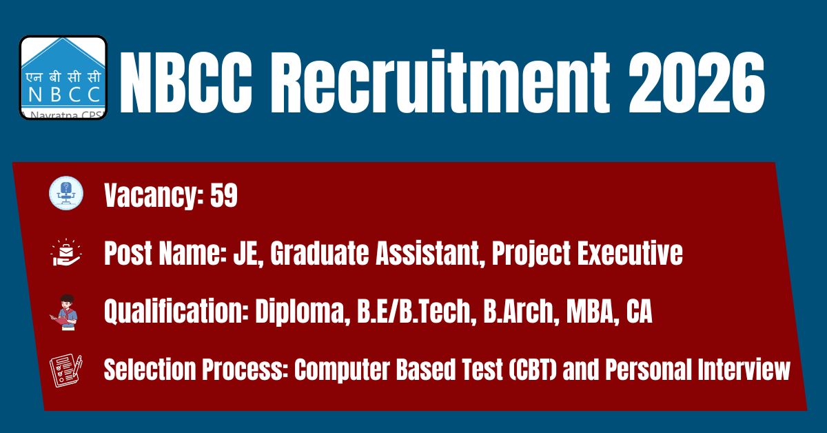 NBCC has released the recruitment notification No: 01/2026 to fill the 59 JE, Graduate Assistant, Sr. Project Executive, Deputy Manager, Assistant Manager, Manager & General Manager Posts. This online facility will be available on the Official website @ https://nbccindia.in/ from 06.03.2026 at 10.00 AM to 05.04.2026 at 05.00 PM. Before submitting an application, candidates must carefully read the NBCC JE 2026 notification and verify their eligibility.