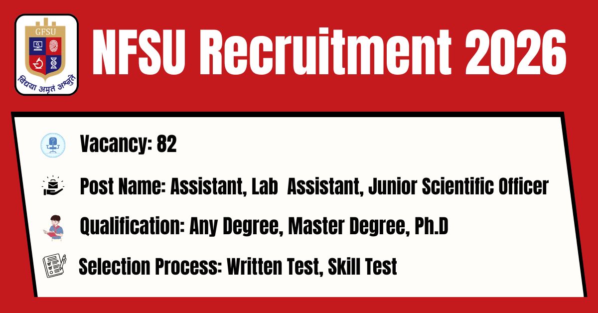 The National Forensic Sciences University has released its latest official recruitment notification (Advt. No. NFSU/TECHNICAL POSTS/01/2026 and NFSU/NON-ACADEMIC/02/2026) to fill the 82 Non Teaching Posts.The online application portal at the official website (https://nfsu.ac.in/) will remain active from 23.02.2026 to 23.03.2026. Before submitting an application, candidates must carefully read the NFSU Non Teaching 2026 notification and verify their eligibility.