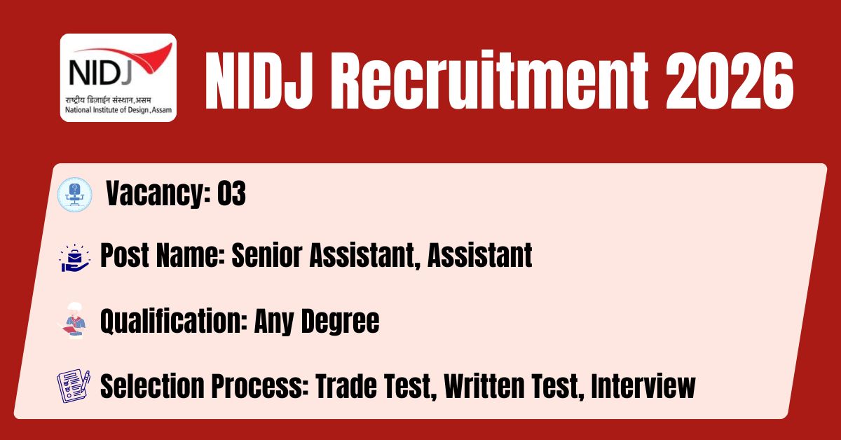 The The National Institute of Design (NID), Assam has officially announced a massive 2026 recruitment Notification (Advt. No. NIDJ/2025 – 26/ Admin./ Rectt./ 100/014) to fill 03 Senior Assistant, Assistant vacancies. The applicants satisfying the requisite qualification may apply through ONLINE MODE only, Apply Online on the official Web-site of this The National Institute of Design (NID), Assam i.e. https://nidj.ac.in/. The online application portal will be opened on 10.04.2026 for filling online applications and the date for closing the online application interface is 10.05.2026.