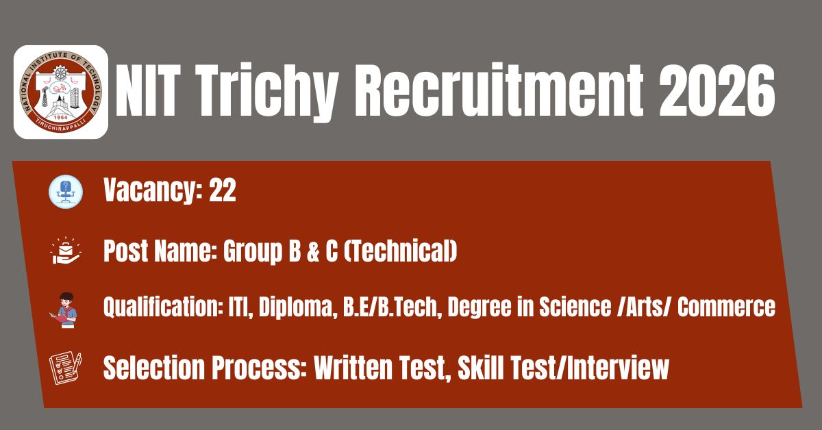 The National Institute of Technology, Tiruchirappalli has released its latest official recruitment notification to fill the 22 Group B & C (Technical Positions) Posts.The online application portal at the official website (https://www.nitt.edu/) will remain active from 25.02.2026 to 25.03.2026. Before submitting an application, candidates must carefully read the NIT Trichy Group B & C (Technical Positions) 2026 notification and verify their eligibility.