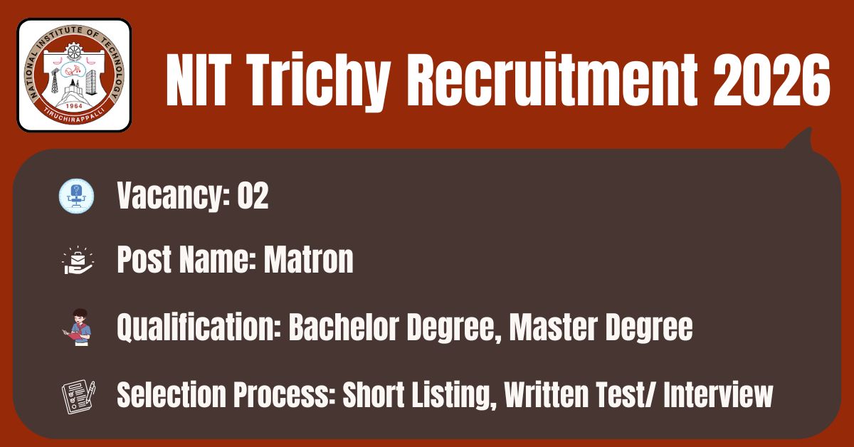 The National Institute of Technology, Tiruchirappalli has released its latest official recruitment notification to fill the 02 Matron Posts. Candidates may get the details of On-line Application, Detailed Advertisement, General Instructions and apply Online on the official Web-site of this National Institute of Technology, Tiruchirappalli i.e. https://www.nitt.edu/. The link for submission of On-line Application Form will remain active from 06.04.2026 to 15.04.2026.