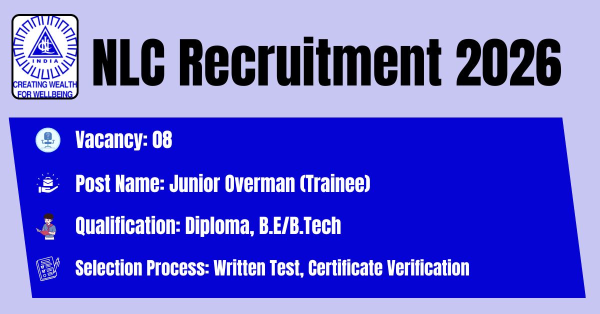 NLC has released the recruitment notification No: 09/2025 to fill the 08 Junior Overman (Trainee), Mining Sirdar (Selection Grade-I) Posts. This online facility will be available on the Official website @ http://www.nlcindia.in/ from 16.02.2026 to 18.03.2026. Before submitting an application, candidates must carefully read the NLC Junior Overman (Trainee) 2026 notification and verify their eligibility.
