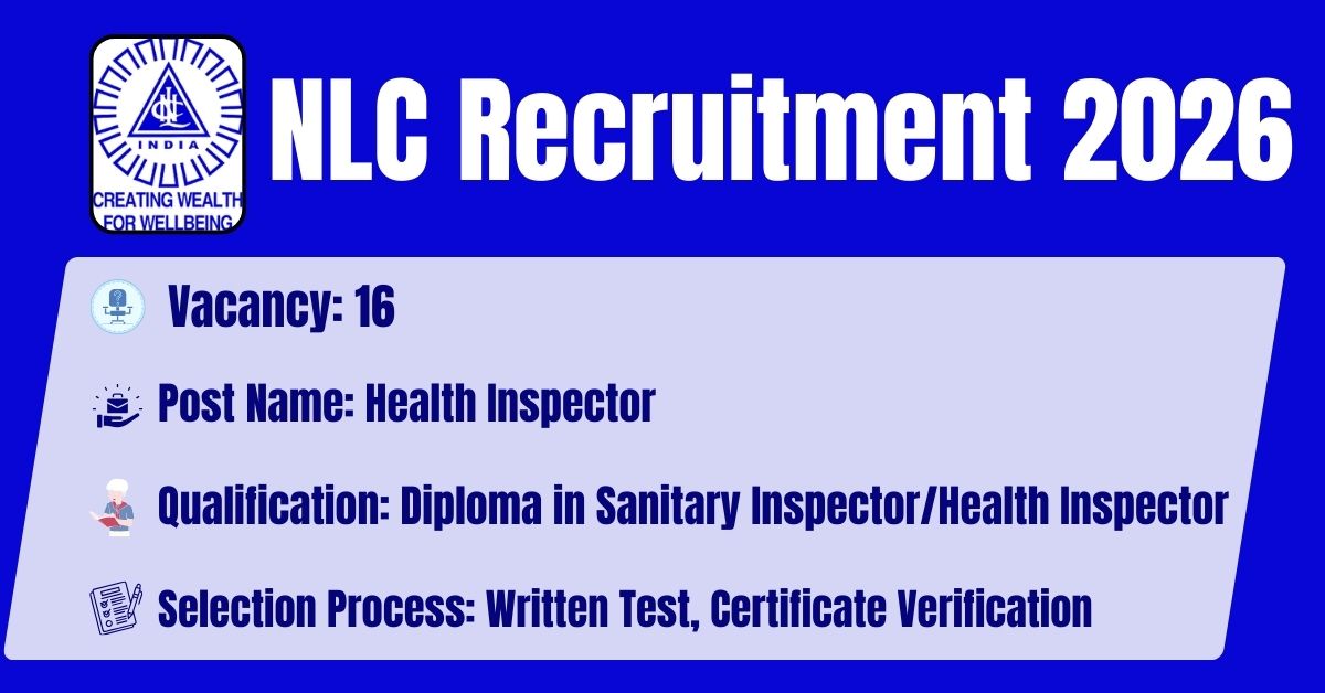The NLC India Limited has released its latest official recruitment notification (Advt. No. 02/2026) to fill the 16 Health Inspector Posts.The online application portal at the official website (https://www.nlcindia.in/) will remain active from 04.03.2026 at 10.00 AM to 02.04.2026 at 05.00 PM.