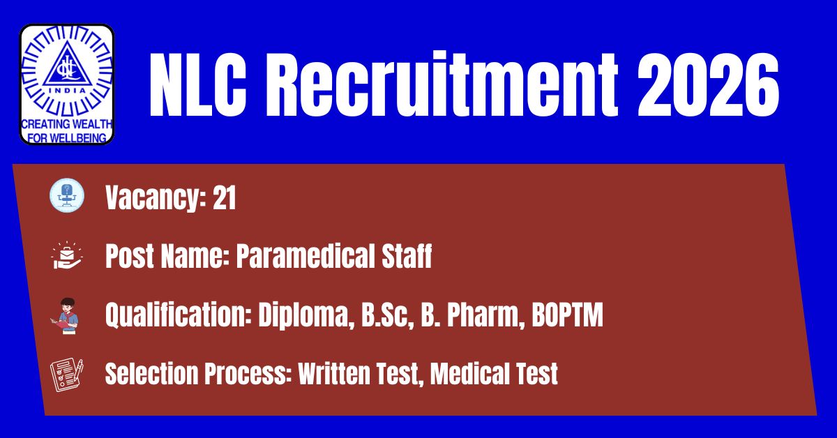 NLC has released the recruitment notification No: 20/2024 to fill the 21 Pharmacist Gr.B, Ophthalmic Technician, Theatre Assistant, Audiologist and Speech Therapist, Dental Mechanic Posts. This online facility will be available on the Official website @ https://www.nlcindia.in/ from 09.02.2026 to 10.03.2026. Before submitting an application, candidates must carefully read the NLC Paramedical Staff 2026 notification and verify their eligibility.