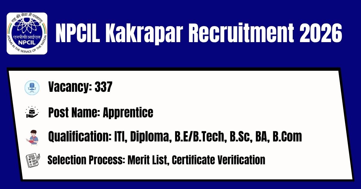 The Nuclear Power Corporation Of India Limited Kakrapar has released its latest official recruitment notification to fill the 337 Trade Apprentice, Technician Apprentice, Graduate Apprentice Posts. Candidates may get the details of On-line Application, Detailed Advertisement, General Instructions and apply Online on the official Web-site of the Nuclear Power Corporation Of India Limited Kakrapar i.e. https://www.npcil.nic.in/. The link for submission of On-line Application Form will remain active from 20.03.2026 to 06.04.2026.