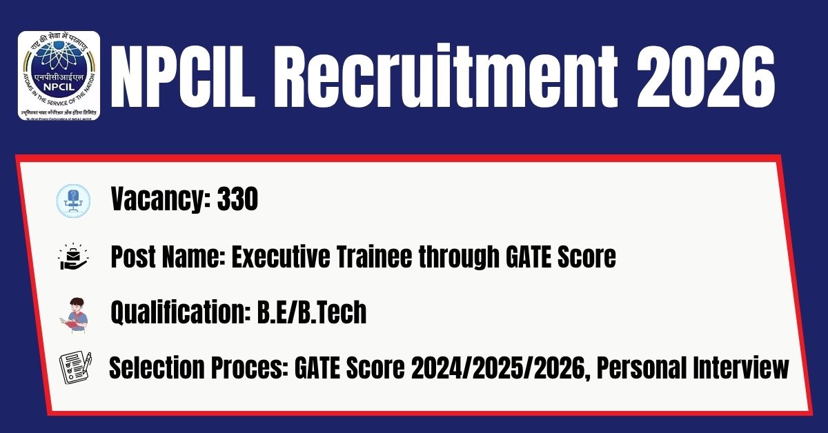 The NPCIL – Nuclear Power Corporation of India Limited has released its latest official recruitment notification (Advt. No. NPCIL/HQ/HRM/ET/2026/02) to fill the 330 Executive Trainee through GATE Score 2024/2025/2026 Posts. Candidates may get the details of On-line Application, Detailed Advertisement, General Instructions and apply Online on the official Web-site of this NPCIL – Nuclear Power Corporation of India Limited i.e. https://www.npcilcareers.co.in/. The link for submission of On-line Application Form will remain active from 10.04.2026 at 10.00 AM to 30.04.2026 at 04.00 PM.