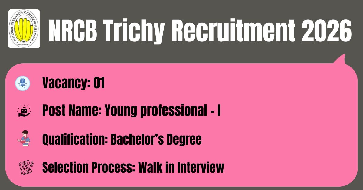 NRCB Trichy has released the recruitment notification No: 06 / 2026 to fill the 01 Young professional – I Posts. The application form should be downloaded in PDF format from the official website @ https://nrcb.org.in/. The last date for the receipt of Filled application along with all enclosures is 20.04.2026. Before submitting an application, candidates must carefully read the NRCB Trichy Young professional – I 2026 notification and verify their eligibility.