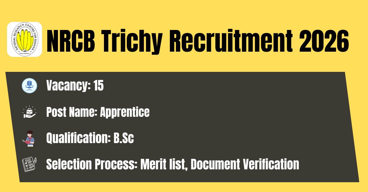 The NRCB – National Research Centre for Banana has released its latest official recruitment notification to fill the 15 Graduate Apprentices Posts. Candidates may get the details of On-line Application, Detailed Advertisement, General Instructions and apply Online on the official Web-site of this NRCB – National Research Centre for Banana i.e. https://nrcb.org.in/. The link for submission of On-line Application Form will remain active from 30.03.2026 to 15.04.2026.