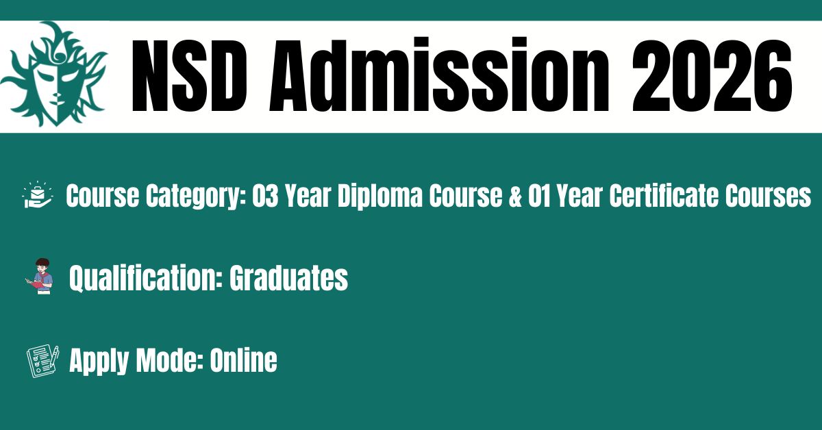 The National School of Drama has officially released its 2026 Joint Entrance Examination notice for admission to the Three-Year Diploma Course in Dramatics (2026–2029) in New Delhi and various One-Year Certificate Courses (2026–2027) specializing in Dramatic Art, Theatre-in-Education, Acting, and Indian Classical Theatre across regional centers in Gangtok, Agartala, Bengaluru, and Varanasi. All courses are scheduled to commence on 15.07.2026, and interested candidates are required to apply through the official portal at https://admission.nsd.gov.in/.