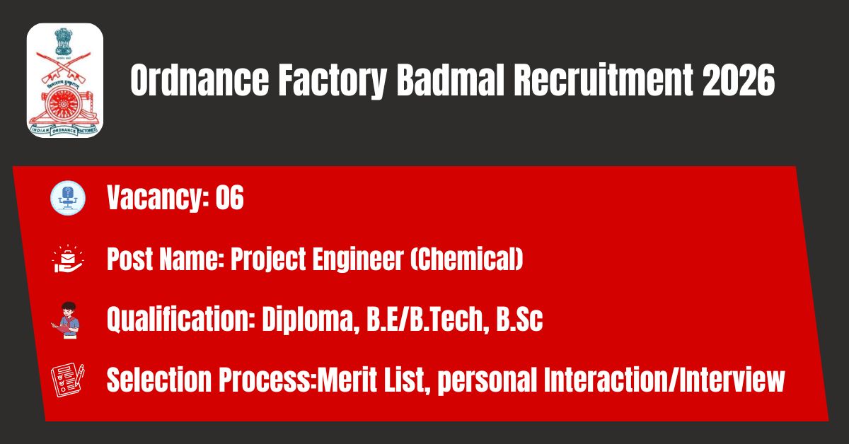 Ordnance Factory Badmal has released the recruitment notification No: (No.1002/Tenure/Project Engineer/PER(RC)/OFBL/2026) to fill the 06 Graduate/ Diploma Project Engineer (Chemical) Posts. The application form should be downloaded in PDF format from the official website @ https://ddpdoo.gov.in/. The last date for the receipt of Filled application along with all enclosures is 24.04.2026. Before submitting an application, candidates must carefully read the Ordnance Factory Badmal Graduate/ Diploma Project Engineer (Chemical) notification and verify their eligibility.