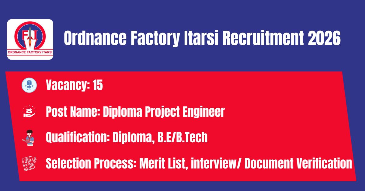Ordnance Factory Itarsi has released the recruitment notification to fill the 15 Diploma Project Engineer (Chemical) Posts. The application form should be downloaded in PDF format from the official website @ https://ddpdoo.gov.in/. The last date for the receipt of Filled application along with all enclosures is 10.04.2026. Before submitting an application, candidates must carefully read the Ordnance Factory Itarsi Diploma Project Engineer (Chemical) notification and verify their eligibility.