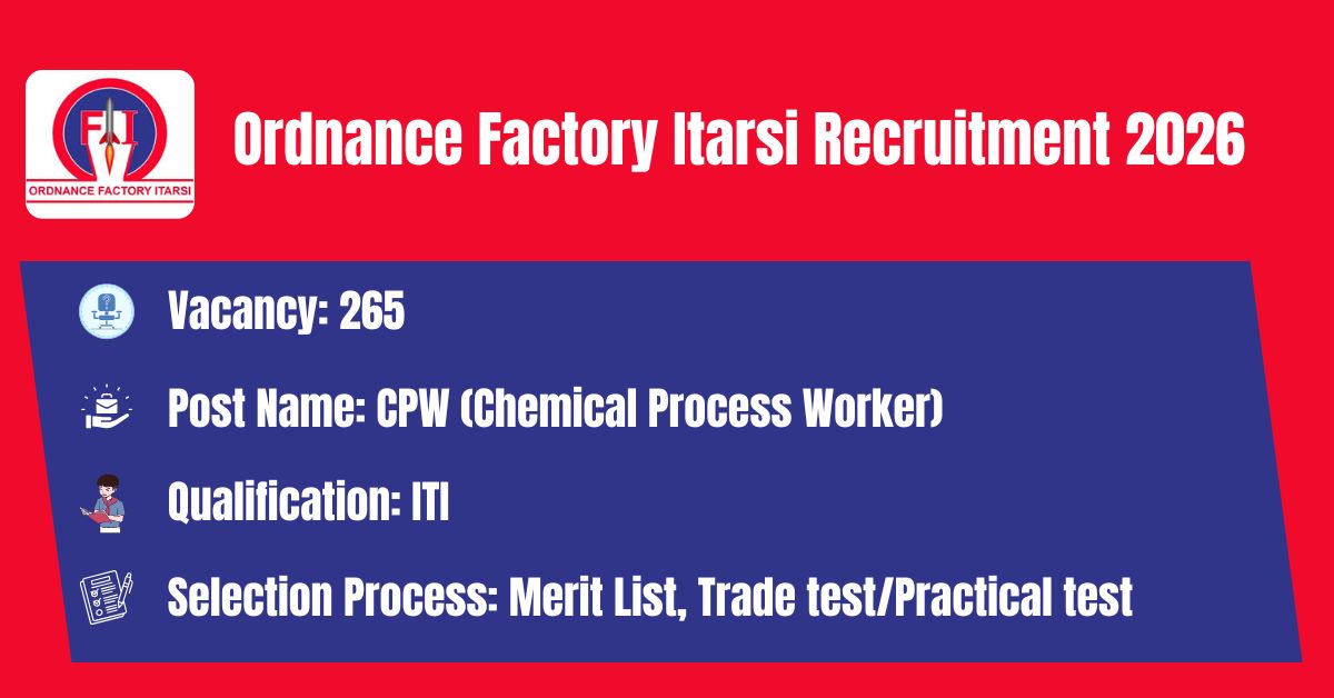 Ordnance Factory Itarsi has released the recruitment notification to fill the 265 CPW (Chemical Process Worker) Posts. The application form should be downloaded in PDF format from the official website @ https://ddpdoo.gov.in/. The last date for the receipt of Filled application along with all enclosures is 10.04.2026. Before submitting an application, candidates must carefully read the Ordnance Factory Itarsi CPW (Chemical Process Worker) notification and verify their eligibility.