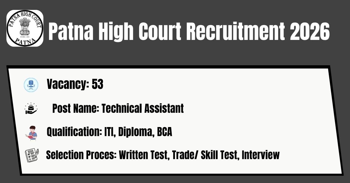 The Patna High Court has released its latest official recruitment notification (Advt. No. PHC/01/2026) to fill the 53 Technical Assistant Posts. Candidates may get the details of On-line Application, Detailed Advertisement, General Instructions and apply Online on the official Web-site of this Patna High Court i.e. https://patnahighcourt.gov.in/. The link for submission of On-line Application Form will remain active from 01.04.2026 to 30.04.2026.