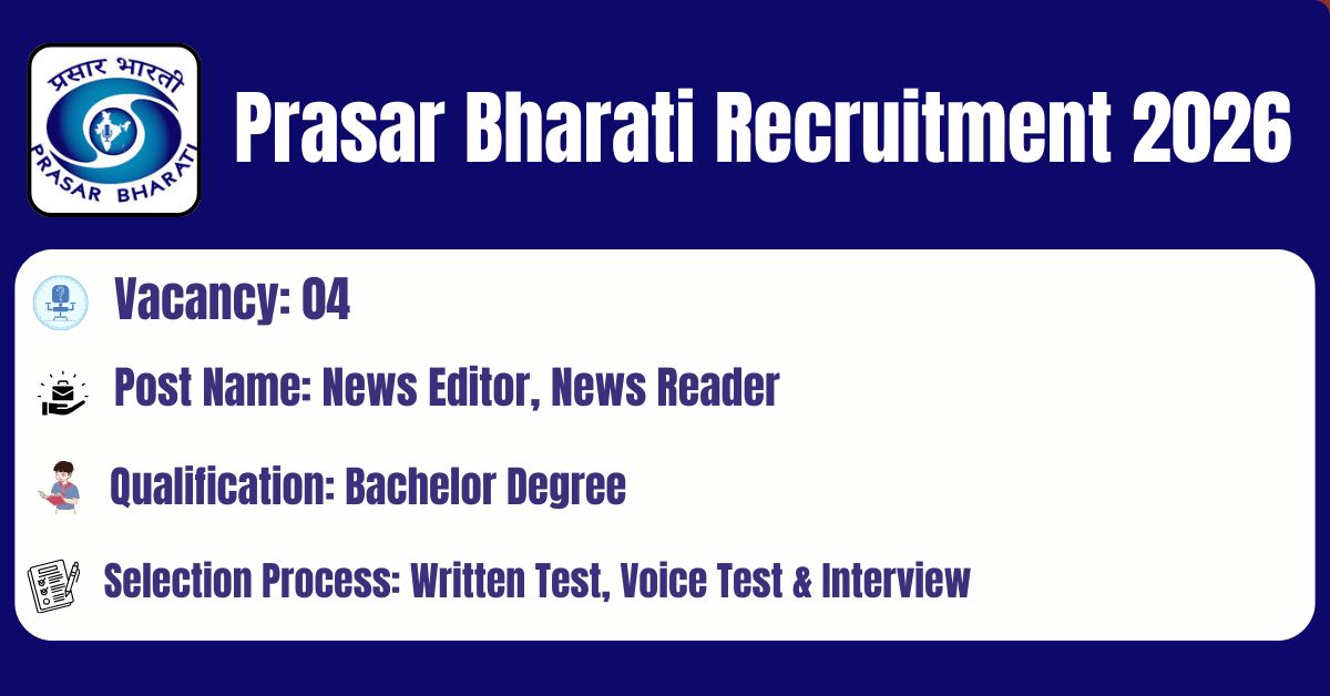 Prasar Bharati has released the recruitment notification to fill the 04 Casual News Editor, Casual News Reader English, Casual Broadcast Executive, Website Assistant Posts. The application form should be downloaded in PDF format from the official website @ https://prasarbharati.gov.in/. The last date for the receipt of Filled application along with all enclosures is 20.03.2026. Before submitting an application, candidates must carefully read the Prasar Bharati News Editor, News Reader notification and verify their eligibility.