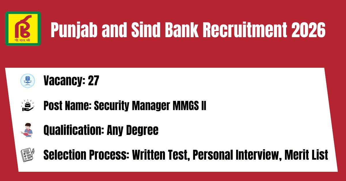 The Punjab and Sind Bank has released its latest official recruitment notification to fill the 27 Security Manager MMGS II Posts. Candidates may get the details of On-line Application, Detailed Advertisement, General Instructions and apply Online on the official Web-site of this Punjab and Sind Bank i.e. https://punjabandsind.bank.in/. The link for submission of On-line Application Form will remain active from 15.04.2026 to 05.05.2026.