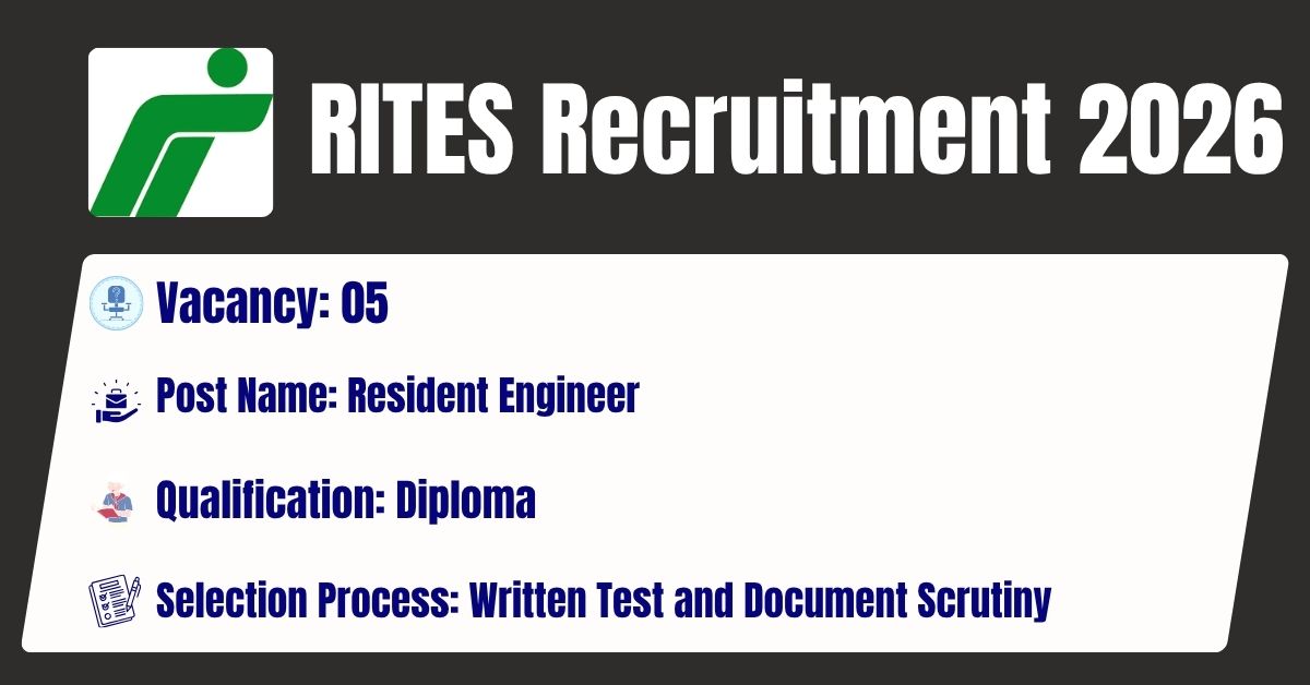 The Rail India Technical and Economic Service has released its latest official recruitment notification (Advt. No. RG/08-10/26) to fill the 05 Resident Engineer Posts. Candidates may get the details of On-line Application, Detailed Advertisement, General Instructions and apply Online on the official Web-site of this RITES Ltd i.e. https://rites.com/. The link for submission of On-line Application Form will remain active from 02.04.2026 to 27.04.2026.