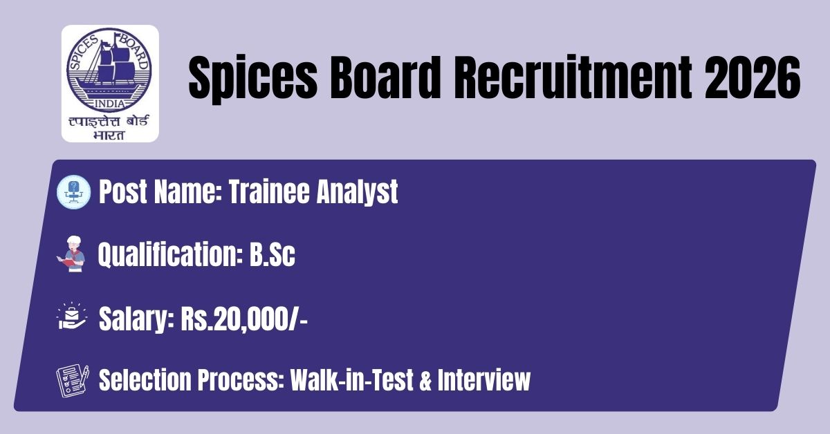 Spices Board has released the recruitment notification No: 46/2025 to fill the 02 Trainee Analyst (Chemistry), Trainee Analyst (Microbiology) Posts. The application form should be downloaded in PDF format from the official website @ https://www.indianspices.com/. The last date for the receipt of Filled application along with all enclosures is 30.04.2026. Before submitting an application, candidates must carefully read the Spices Board Trainee Analyst 2026 notification and verify their eligibility.