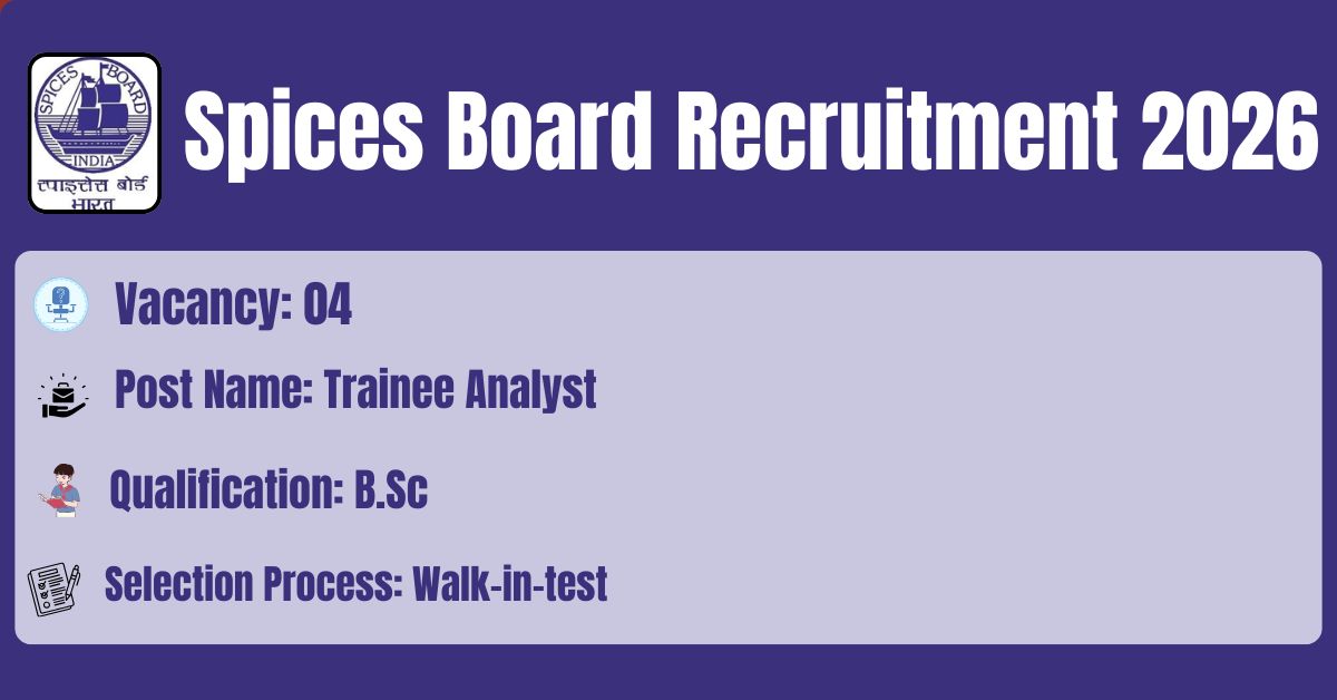 Spices Board has released the recruitment notification No: 36/2025 to fill the 04 Trainee Analyst (Microbiology) , Trainee Analyst (Chemistry) Posts. The application form should be downloaded in PDF format from the official website @ https://www.indianspices.com/. Before submitting an application, candidates must carefully read the Spices Board Trainee Analyst 2026 notification and verify their eligibility.
